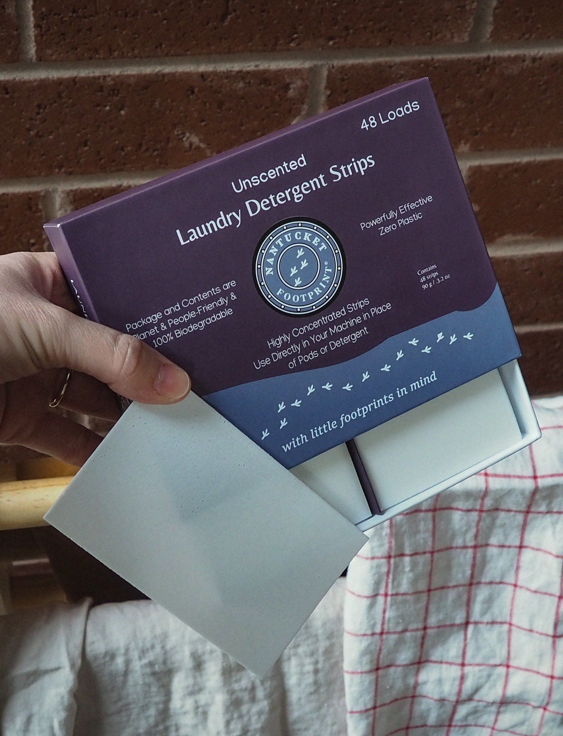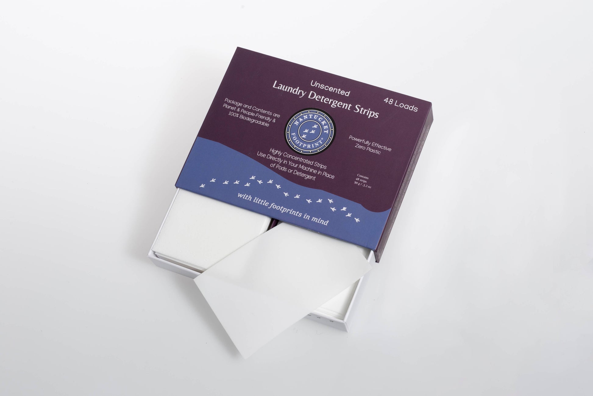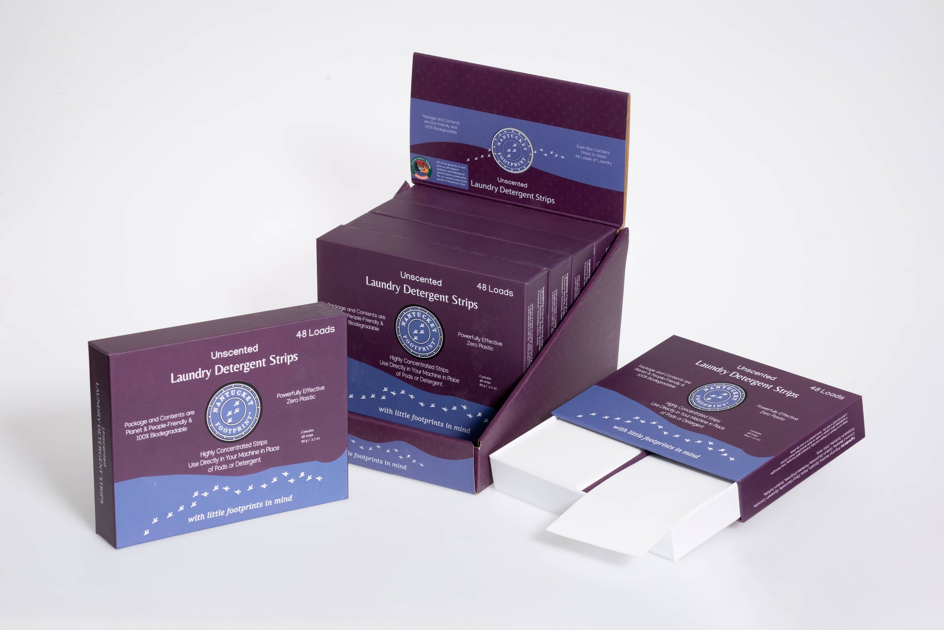Unscented Laundry Detergent (48 Strips/unit). Unlike liquid detergents which are mostly water, take up a lot of room, and have bulky plastic packaging, our laundry strips provide a powerful, safe clean without the plastic and without the water. Unscented and packaged in compact compostable packaging, they work great! Our ingredients are all cosmetic quality, have the safest ratings on the EWG Skin Deep Database, and exclude all ingredients on the Suzuki Dirty Dozen List. Our laundry strips come in an aesthetic, lightweight, 100% compostable box that can sit on your shelf with our other concentrated cleaning strips like a little stack of books. To keep little ones away from our concentrated strips, we have also included a child-safety lock on the back of each box. 48 strips in a package for 48 loads of laundry. 6 Units of Detergent in each display case.