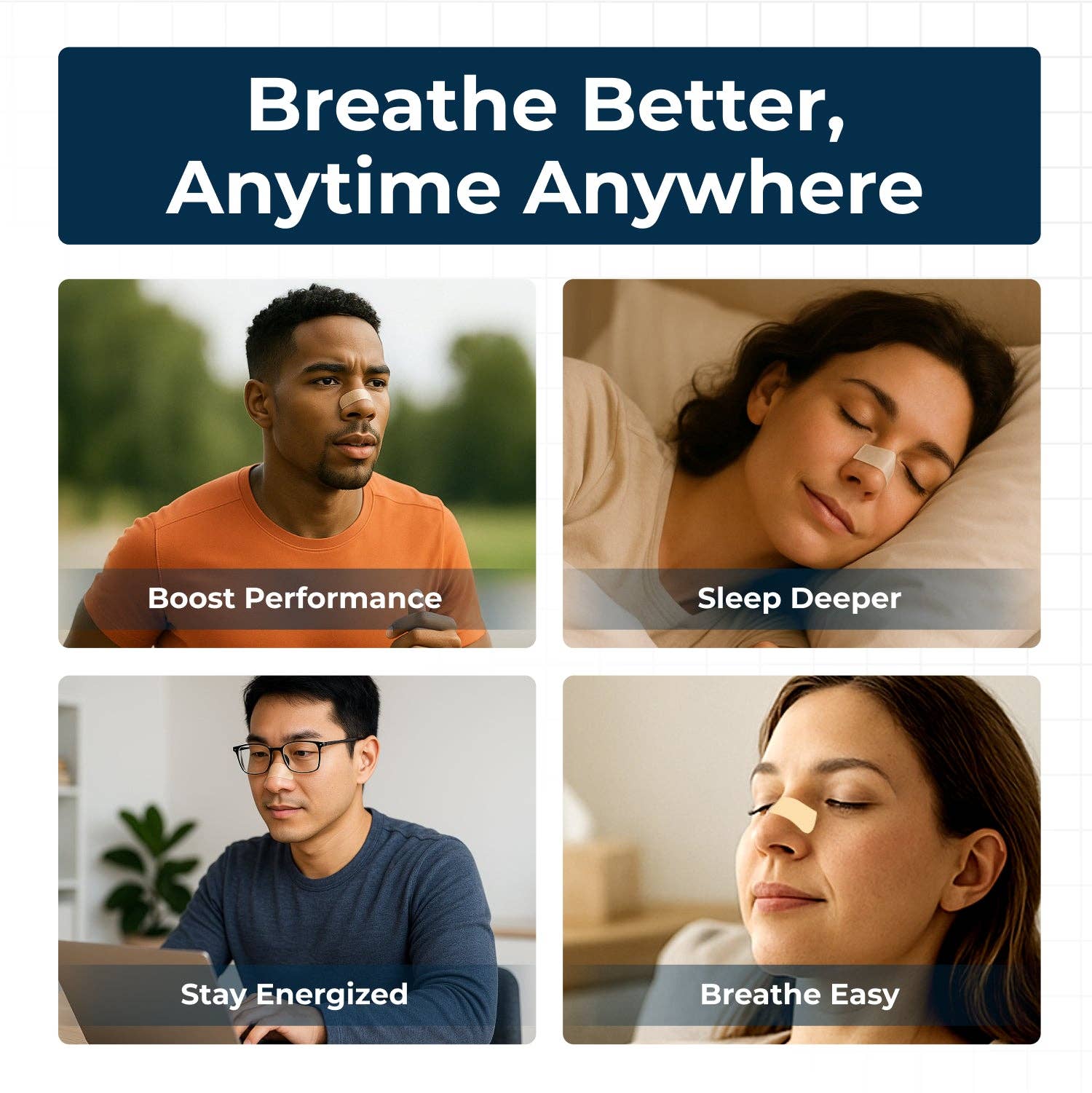 Each strip uses spring-action tension technology to gently open your nasal passages, instantly improving airflow. Say goodbye to congestion, mouth breathing, and restless nights—TapeGeeks is here to help you breathe easier, sleep better, and live fully.